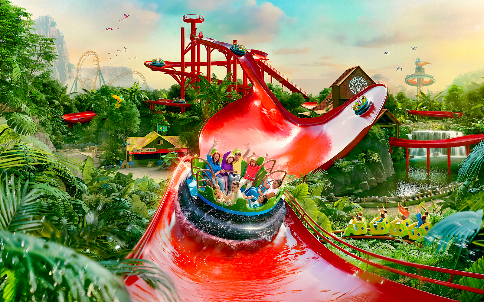 Opened in 2024, Amazonia is a next-gen rapids ride with an inclined lift, rotating elevator, and the world’s first Bungee Drop. Expect bigger splashes, smoother turns, and a high-speed finale in a vividly themed jungle adventure.